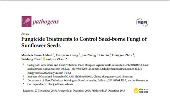 我校“中国政府奖学金”资助的2017级非洲加纳来华硕士留学生Mandela Elorm Addrah和168开奖官网 赵君教授研究团队,经长期的研究积累,于2019年在国际知名期刊MDPI旗下的Pathogen上,发表Fungicide Treatments to Control Seed-borne Fungi of Sunflower Seeds(杀菌剂防控向日葵种子带菌的研究)论文,影响因子达3.65。