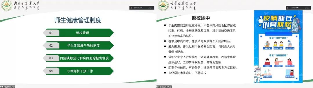 此次会议根据学生返校前后可能遇到的各种疫情特殊情况和对应的预案展开。主要有:“三区两通道”和穿脱防护服等基本知识和技能、师生健康管理制度、应急处置流程及措施和家长信息通报制度四部分内容。会议中,李艳老师对“三区两通道”设置的具体含义和作用做了详细说明。师生健康管理制度方面,从学生返校管理,学生学习、生活中的详细管理措施到学生的心理危机干预工作均做了全面且细致的讲解。学院工作部门与学生和家长做到家校互通,通过多种方式实行信息通报,掌握学生返校前后的实际情况。