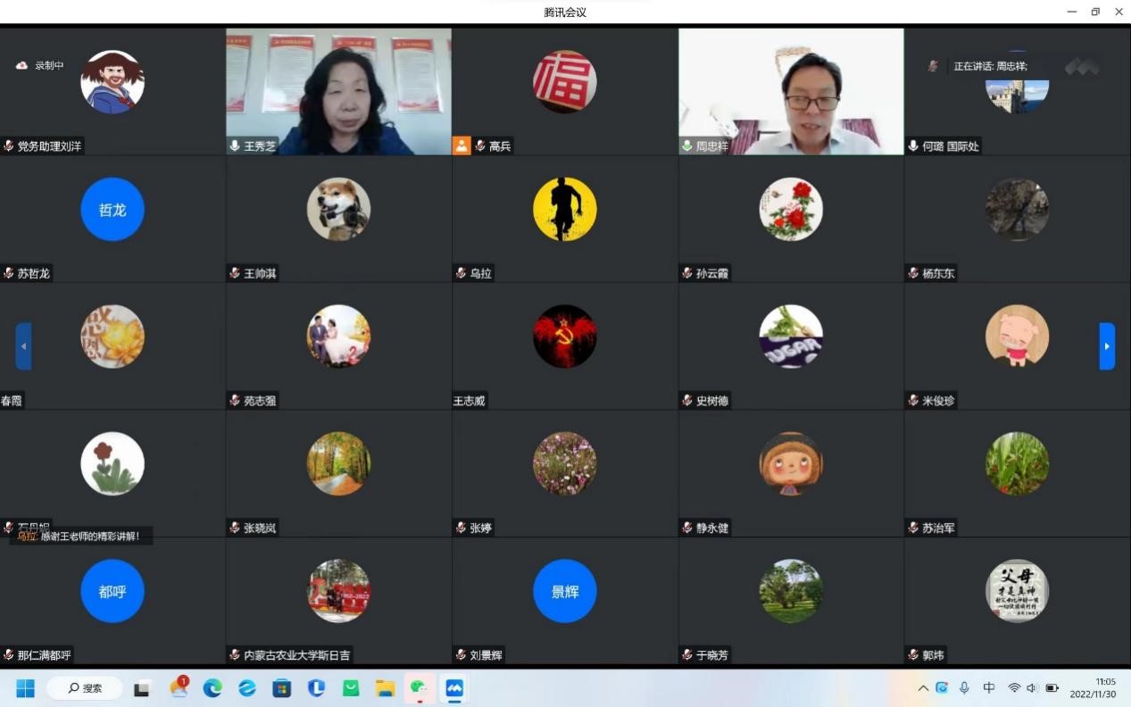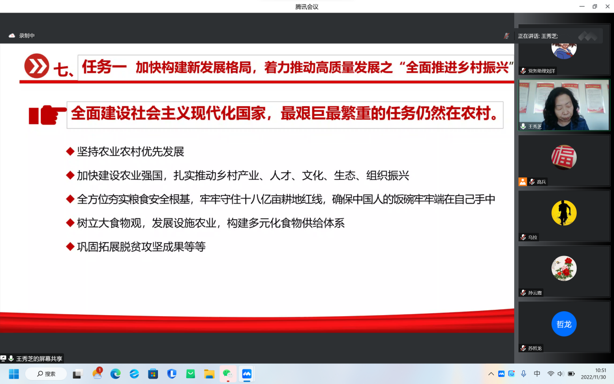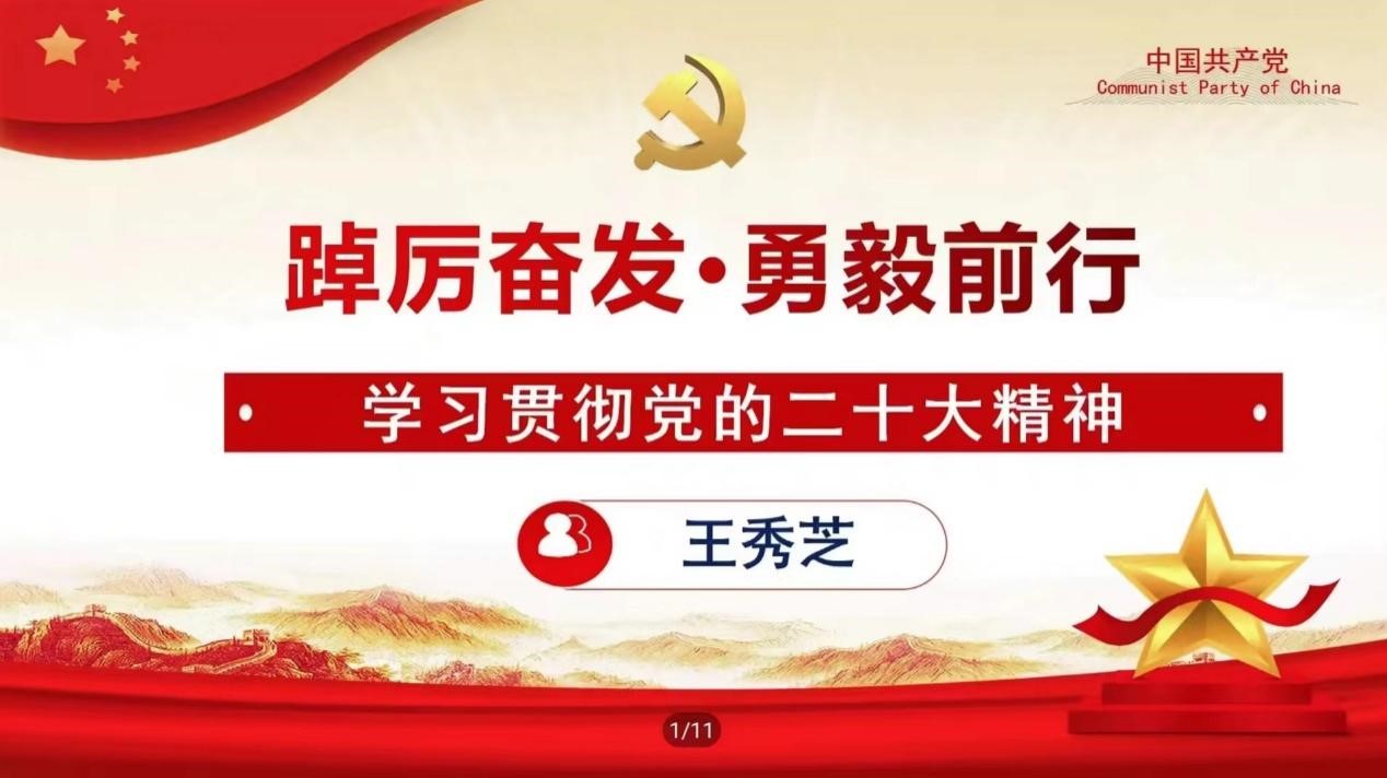 王秀芝校友以《踔厉奋发,勇毅前进》为题,结合自身感受和学习心得从十五个方面向大家系统阐述了党的二十大报告的结构紧密、逻辑严密、文字缜密,党的二十大精神对全党全国各族人民迈上全面建设社会主义现代化国家新征程、向第二个百年奋斗目标进军的重大意义和深远影响;会议强调全面学习、全面把握、全面落实党的二十大精神,是当前和今后一个时期的首要政治任务。我们要高举习近平新时代中国特色社会主义思想伟大旗帜,深入学习宣传贯彻党的二十大精神,坚定理想信念,志存高远,脚踏实地,在新时代新征程上踔厉奋发,勇毅前进,奋力推动学院事业高质量发展。
