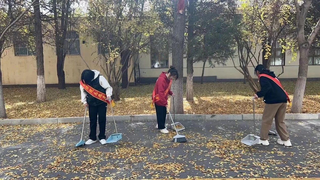 根据值班时间,在各班班长和团支书的带领下,志愿者们到达指定地点,大家清理宿舍楼门口落叶,清理道路烟蒂和垃圾等,充分体现了“奉献、友爱、互助、进步”的志愿服务精神。在活动过程中,大家协作配合,互帮互助,在秋风习习的志愿服务中增添了些许暖意。