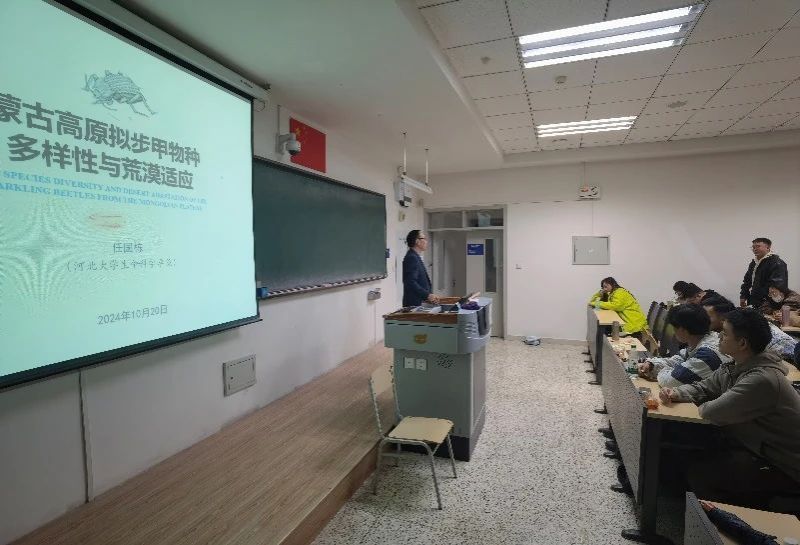 2024年10月20日下午,2024级博士生、硕士生的前沿进展课程在内蒙古农业大学南教A218如期举行,108名师生聆听了河北大学任国栋教授的特邀讲座。任教授主研昆虫多样性、甲虫系统学、昆虫生物地理学、文化昆虫学等;开创性开展了中国20多个未知甲虫科的系统分类研究,命名昆虫新属种近700个;主持科研项目83个(国家级32项,省部级和社会项目51项),获得省部级成果8项;编著学术专著52部,发表论文600余篇;在昆虫区系和区域生态地理方面提出新观点;指导9项大学生科技竞赛作品荣获全国奖项。