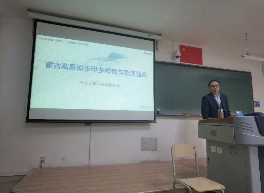 在本次课程中,任教授从蒙古高原拟步甲研究现状、蒙古高原拟步甲物种多样性与区系、蒙古高原拟步甲的荒漠适应、蒙古高原拟步甲研究展望四个方面,和同学们分享了“蒙古高原拟步甲物种多样性与荒漠适应”的理论和实践知识,以及任教授带领学生野外采集标本40余年的充满着快乐和艰难险阻的精彩故事。他特别强调了:虫子小,事业大,昆虫学研究是永无止境的探索之路;要有情怀,充满激情,不忘初心;要把经典形态学分类方法和现代科学技术的紧密结合,敢于创新,勇于突破;孜孜以求,坚持不懈,遇到难题,不放弃,要执着、热爱昆虫学事业;立足当地,为国家增光、增荣;把心血洒在祖国大地上,服务社会、传承文化。人生就是在赛跑,要有目标,有方向,有着不输的信念,朝着目标不断努力。