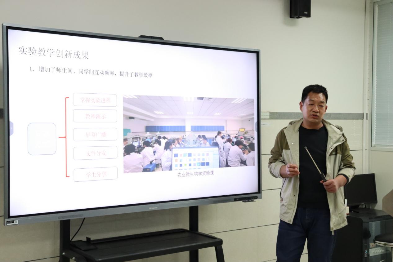 随后,比赛正式开始。参赛教师们依次走上讲台,带来了一场场精彩纷呈的教学展示。东保柱老师带来《农业微生物学》实验课教学创新成果报告,他打破传统实验教学模式,通过引入显微互动教学系统,促进了老师与学生间的沟通,也提高了教学效率。