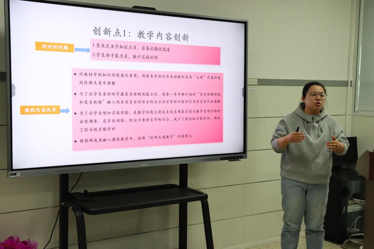 李艳艳老师进行《农业昆虫学》教学设计创新汇报,她总结了同学们在学习中可能会遇到的问题,并一一提出了解决方案。还通过引入小组合作、观看视频等手段让同学们能够更好地融入课堂。另外,李老师还将思政教育与课程进行融合,极大地激发了学生的学习兴趣。