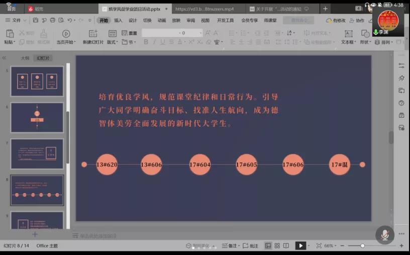 活动中,吕姝睿带同学们一起学习了培育优良学风的重要性,引导同学明确奋斗目标,树立坚定信念,找准人生航向,实现人生理想,成为德智体美劳全面发展的新时代大学生。随后,她强调了近期疫情防控,要求所有的同学坚决克服麻痹思想、厌战思想、侥幸心理、松劲心态,全力筑牢我校疫情防控安全线。接着,同学们以宿舍为单位进行了大学课程学习的感悟交流,大家纷纷表示:特殊时期要克服困难,上好线上课,做好个人防护,听从防疫命令,坚决服从安排,要调整学习生活习惯,坚定努力奋斗的决心。