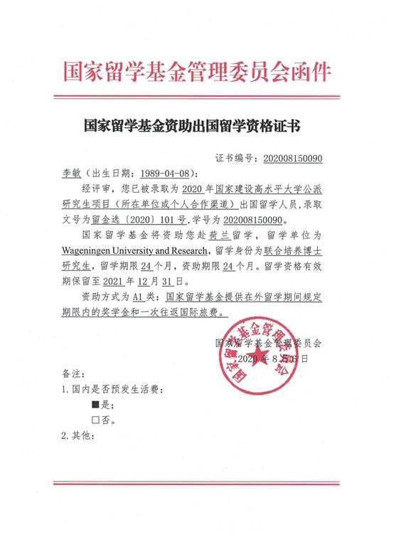 案例三:培养1名博士研究生去荷兰瓦赫宁根大学继续深造,该学生一致在Ton Bisseling院士的指导下完成相应的研究,具有很好的研究基础,通过努力,申请并获得国家留学基金委资助的公派留学资格。