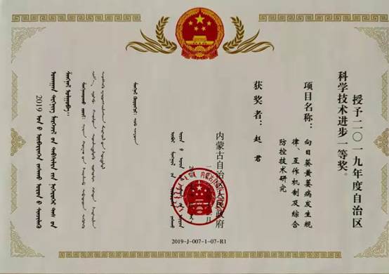 案例一:获得内蒙古自治区科技进步一等奖,从病原菌生物学特性、病害发生规律、向日葵与黄萎病菌互作机制和综合防控体系研究四个方面,深入研究向日葵黄萎病的发生规律和绿色防控技术,形成一套从黄萎病发生、鉴定、防控为一体的综合防控技术。