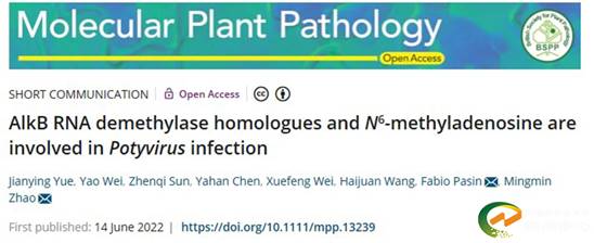 赵明敏教授实验室分别在国际知名期刊《Molecular Plant Pathology》(JCR Q1,中科院一区,植物科学领域TOP)、《Biology》(JCR Q1,中科院二区)上发表了两篇关于m6A甲基化修饰调控马铃薯Y病毒属病毒侵染的研究成果。题目为“AlkB RNA demethylase homologues and N6-methyladenosine are involved in Potyvirus infection”(RNA去甲基化酶AlkB同源物和m6A甲基化参与马铃薯Y病毒属病毒侵染)和“The reversible methylation of m6A is involved in plant virus infection”(可逆的m6A甲基化修饰参与植物病毒侵染)。