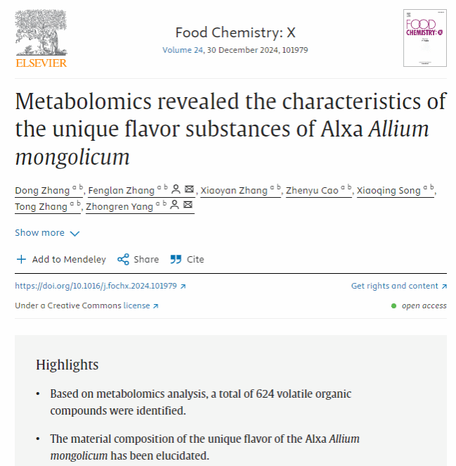 杨忠仁教授团队以内蒙古农业大学为第一单位,在中国科学院分区的一区期刊《Food Chemistry: X》发表了题为“Metabolomics revealed the characteristics of the unique flavor substances of Alxa Allium mongolicum”的研究成果。论文第一作者为青年教师张东,杨忠仁教授和张凤兰教授为通讯作者。