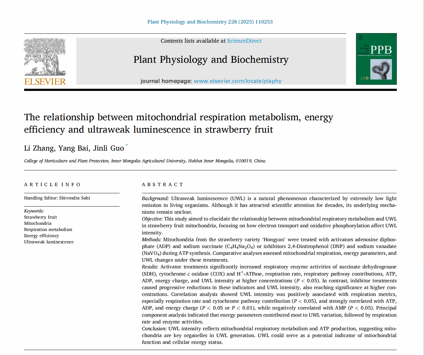 郭金丽教授团队以内蒙古农业大学为第一单位,在《Plant Physiology and Biochemistry》(中科院二区TOP期刊)上发表2项题为Relationship between photosystem activity and ultraweak luminescence excitation in Cerasus humilis leaves under low light stress和题为The relationship between mitochondrial respiration metabolism, energy efficiency and ultraweak luminescence in strawberry fruit的研究成果。2篇论文分别以168开奖网app-168开奖官网