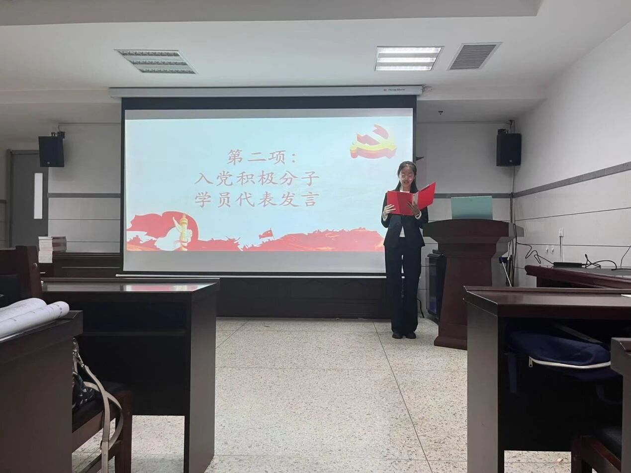 二是入党积极分子代表上台发言,王学敏同学在发言中真挚的表达了对党的忠诚与热爱,同时郑重表态将加倍珍惜此次党课学习机会,以积极饱满的态度投入学习,展现出新时代青年向党组织靠拢的坚定决心。