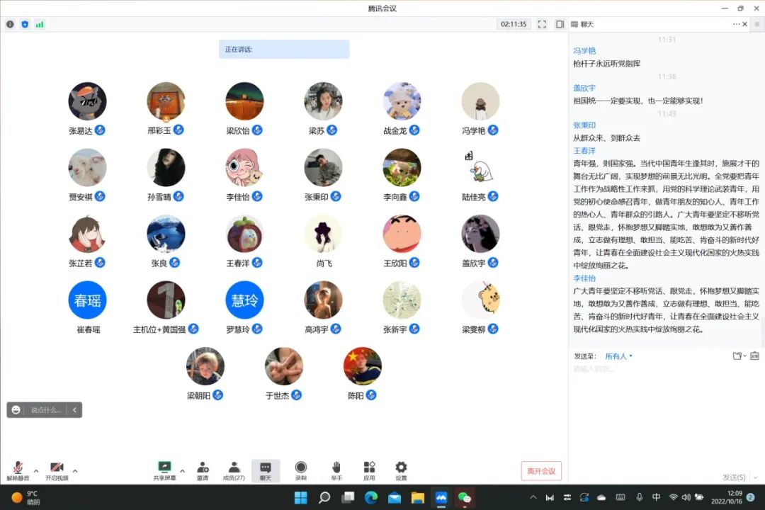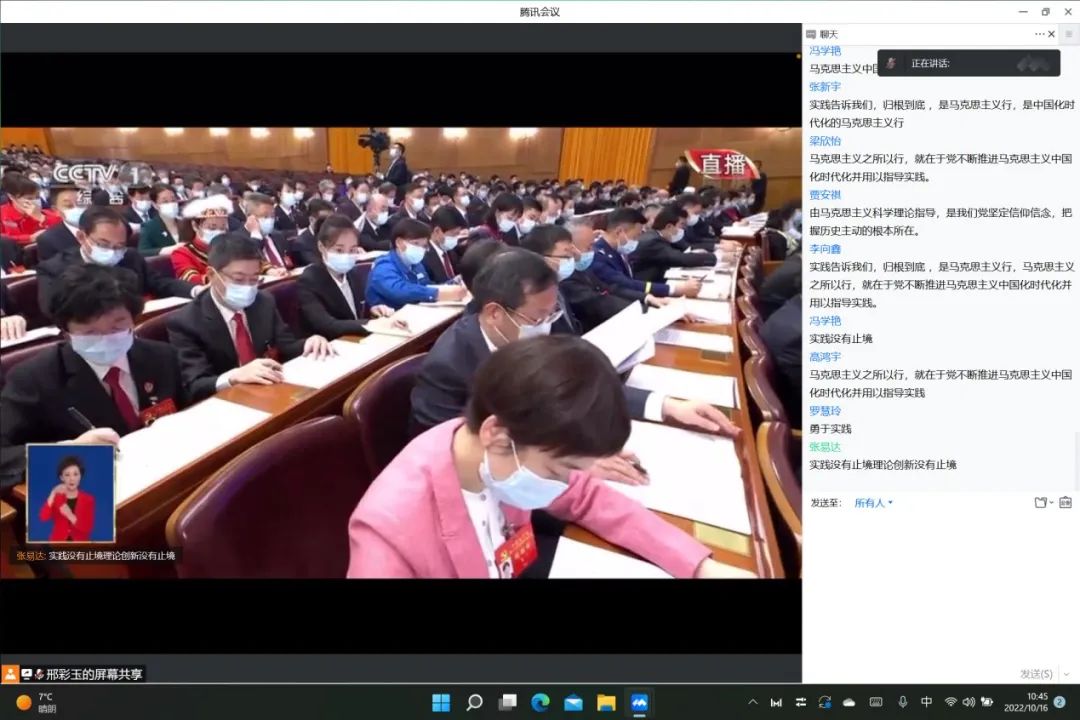 大会的主题是:高举中国特色社会主义伟大旗帜,全面贯彻新时代中国特色社会主义思想,弘扬伟大建党精神,自信自强、守正创新,踔厉奋发、勇毅前行,为全面建设社会主义现代化国家、全面推进中华民族伟大复兴而团结奋斗。大家认真聆听习近平总书记所作的报告,“全党同志务必不忘初心、牢记使命,务必谦虚谨慎、艰苦奋斗,务必敢于斗争、善于斗争,坚定历史自信,增强历史主动,谱写新时代中国特色社会主义更加绚丽的华章。”“新时代的伟大成就是党和人民一道拼出来、干出来、奋斗出来的!”党员同志们在听到总书记的精彩讲话后,纷纷在留言板上打出了习总书记的金句以及自己在观看过程中的所感所想。