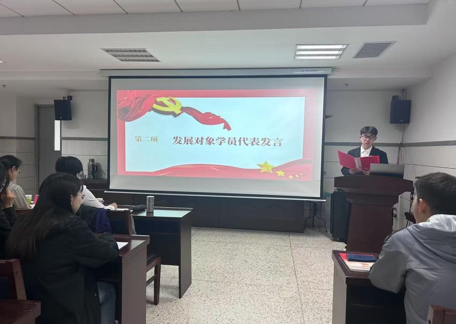 在雄壮的国歌声中,典礼正式拉开序幕。首先,发展对象代表张术博同学发表讲话,他强调作为发展对象,必须在青年学生中发挥表率作用,以“三个自觉”为准则,即自觉深入学习、深刻领会,自觉对照标准、查找差距,以及自觉承担起责任、积极行动,努力成为新时代的优秀青年,并积极争取早日加入中国共产党。