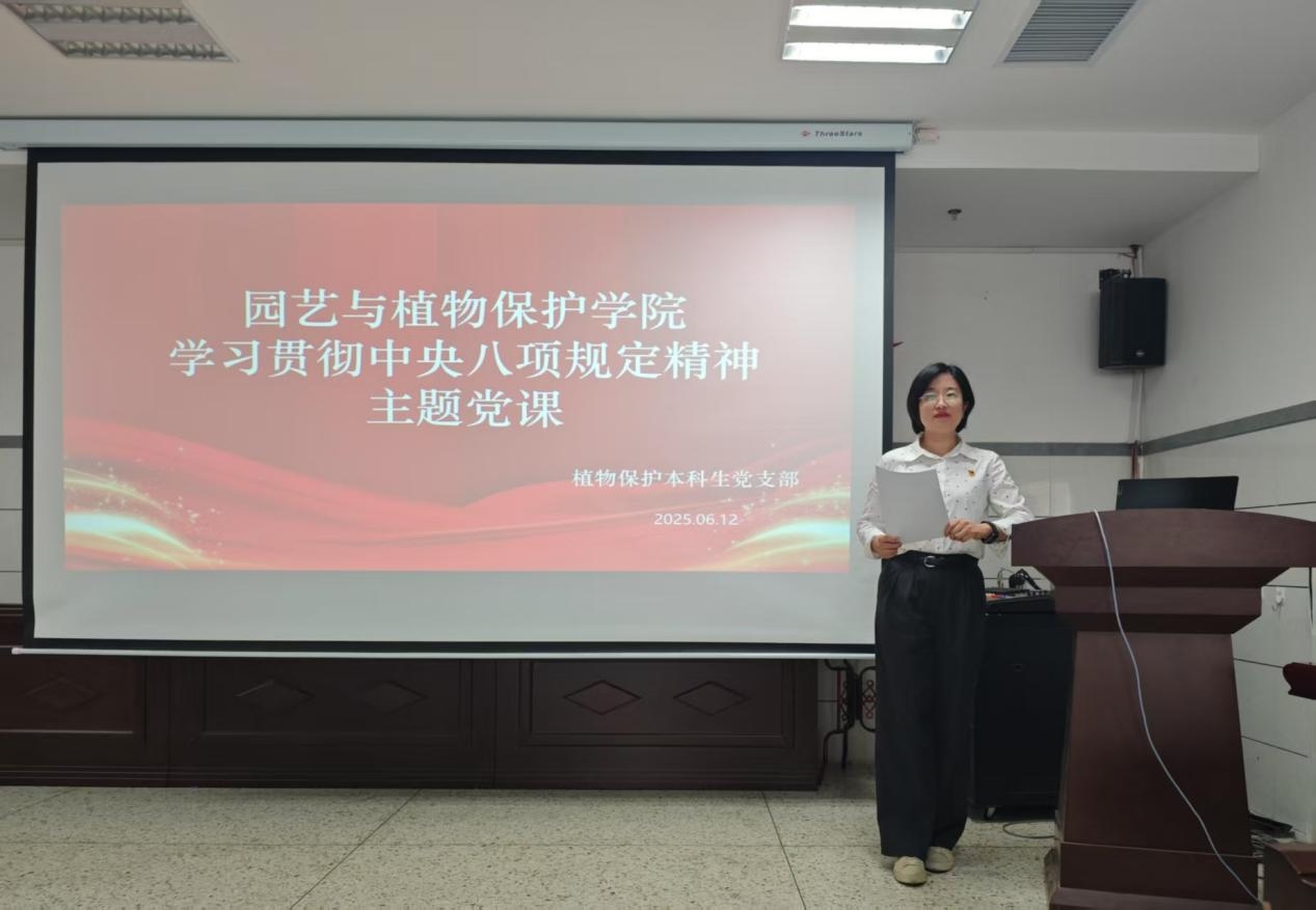 植物保护本科生党支部于06月12日晚在生科楼419室举办专题党课,此次党课由植物保护本科生党支部书记尤丽老师主讲。全体党员参加。