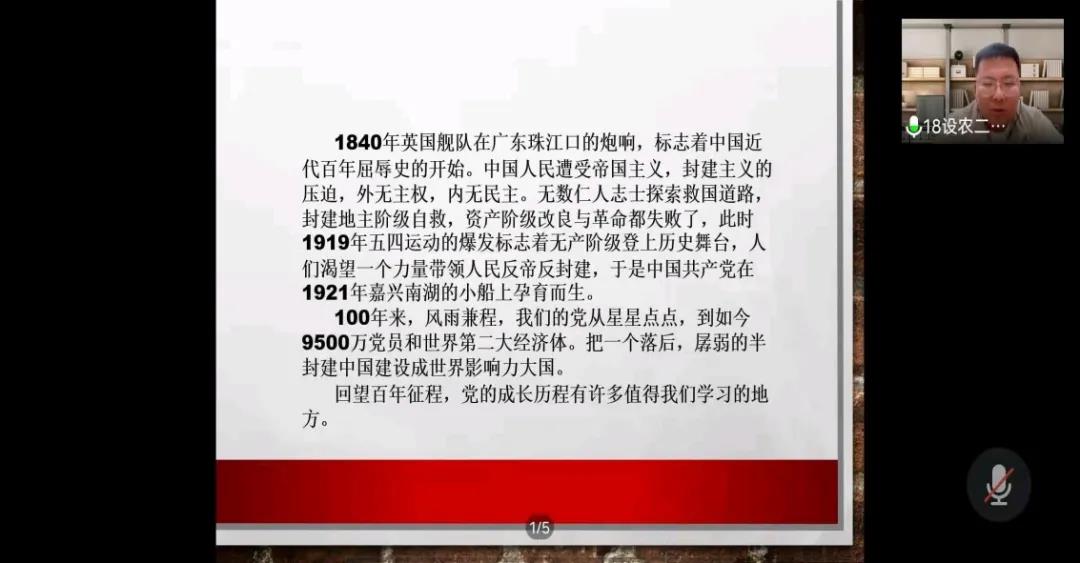 讨论课上,发展对象培训班的同学们积极交流,围绕主题结合近一年的党史学习教育,从不同的角度出发,发表自己对主题的见解。其中,18级植物保护一班王心怡通过视频的方式将曾经落后的中国与如今迅猛发展的中国作对比,使同学们直观地看到中国的崛起;19级植物保护三班贾安祺认为当代青年应当不负党的期望,努力完成党交给我们的任务,做有底气,有志气,有骨气的青年人。最后,党员代表张芷若表示:“学党史、强信念、跟党走”主题教育的学习,使自己深刻感悟到中国共产党百年历程的艰辛,从一个仅有50多人的小党发展到如今拥有9500多万党员的大党实属不易,希望大家能一同坚定理想信念,珍惜革命先烈以生命为代价换来的和平,认真传承革命精神,以实际行动践行全心全意为人民服务的宗旨,在今后的学习、生活和工作中充分发挥模范带头作用。