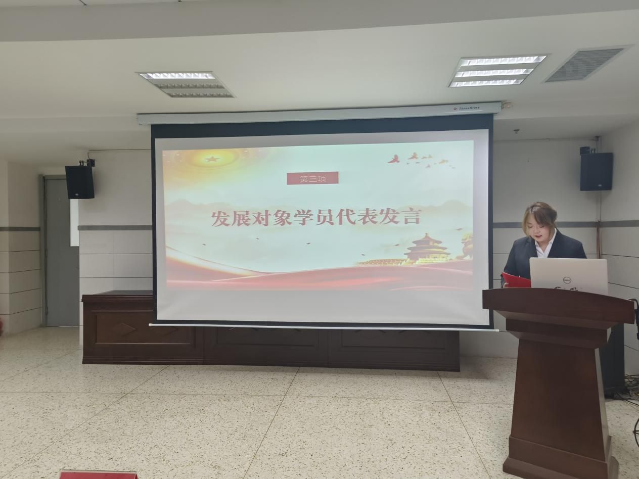随后,发展对象代表闫馨月同学发言,她代表全体发展对象感谢党组织让她们更加全面、系统的学习党的理论知识,使得她们在思想上和认识上能对中国共产党有进一步的理解,也有机会对照党员标准反观我们自身上存在的许多缺点和不足,从而得到进一步的提高,真正做到从思想上入党。最后代表同学们向党组织承诺,珍惜此次党校学习机会,努力提高学习效果,使自身在政治理论和思想道德水平上有明显的提升。她的发言声情并茂,赢得了阵阵掌声。