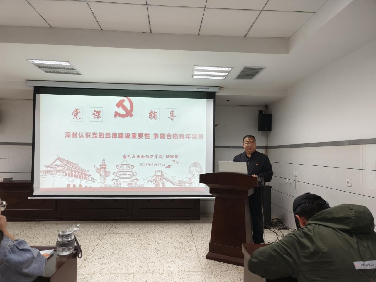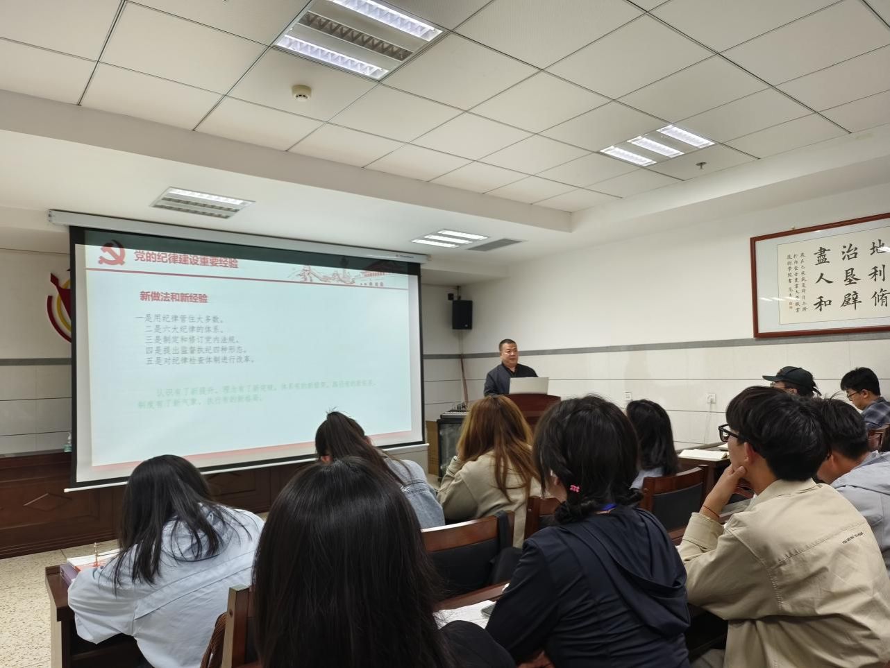 在党课最后,靳国斌书记引用习近平总书记对青年人寄语进行总结,希望同学们自觉学纪,准确知纪,心中明纪,严格守纪,清清白白做人,干干净净做事,早日加入中国共产党。