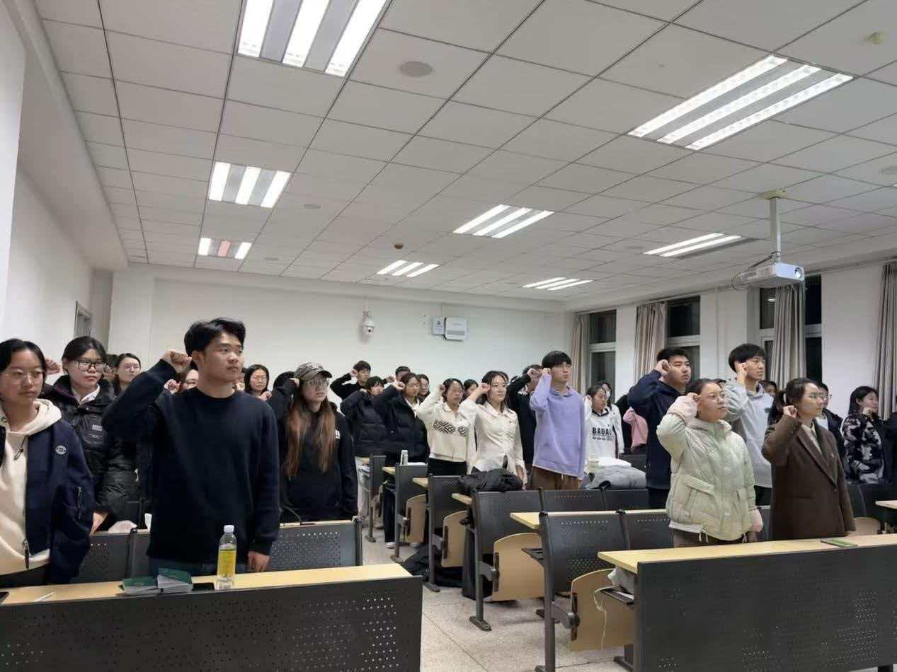 在南教219教室举行入团仪式。学院团委老师郝凤英本期新发展团员、各班团干部参加了仪式。
