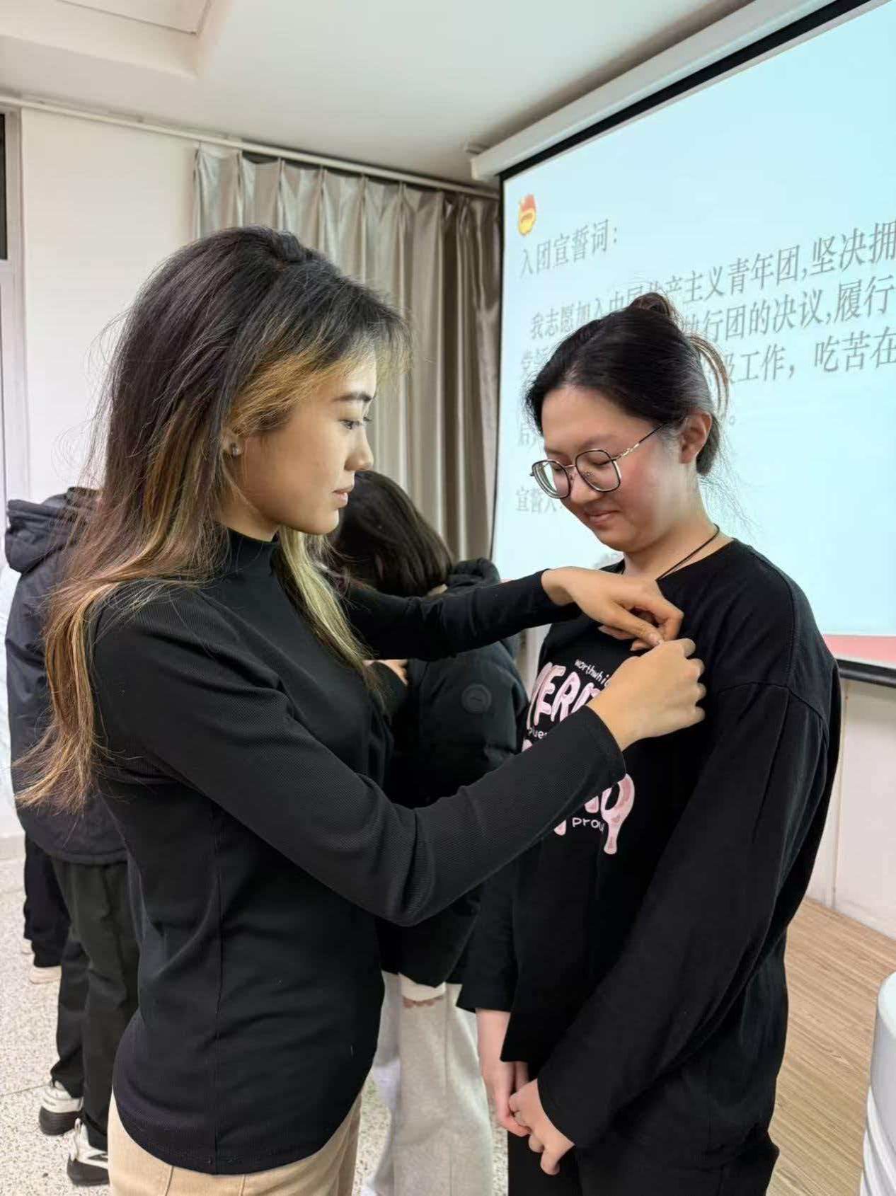 伴随着庄严的国歌响起,本次活动拉开帷幕。各班团支书为本次新发展团员佩戴团徽,神圣庄严的团徽佩戴在每位新团员的左胸,象征着从此刻起,就要担负起作为一名团员的责任和使命。