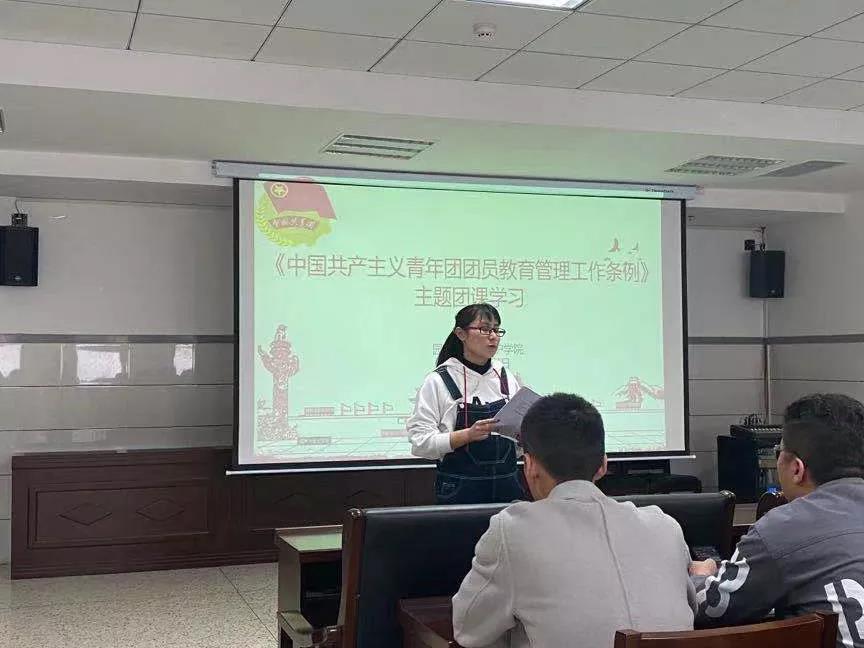 团课中,郝老师围绕《中国共产主义共青年团团员教育管理工作条例(试行)》,结合实际工作中的案例为同学们深刻讲解了条例中内容,要求团干部们提高政治站位,树立大局意识,引导团员在实践中加强巩固中国特色社会主义和共产主义思想,坚持党的领导,突出理想信念;以身作则发挥模范带头作用,创新组织生活方式让同学们积极参加集体活动中;加强自身建设,明晰自己的责任,认真仔细完成每一项工作。团课最后,各班级团干部围绕团组织建设纷纷提出自己的想法,将过往的成功事例与不足之处与大家共同分享。