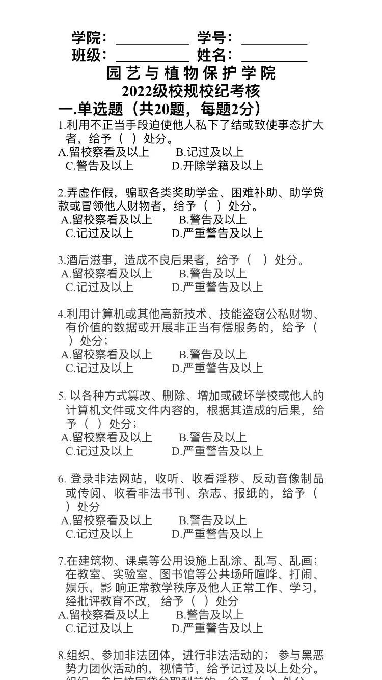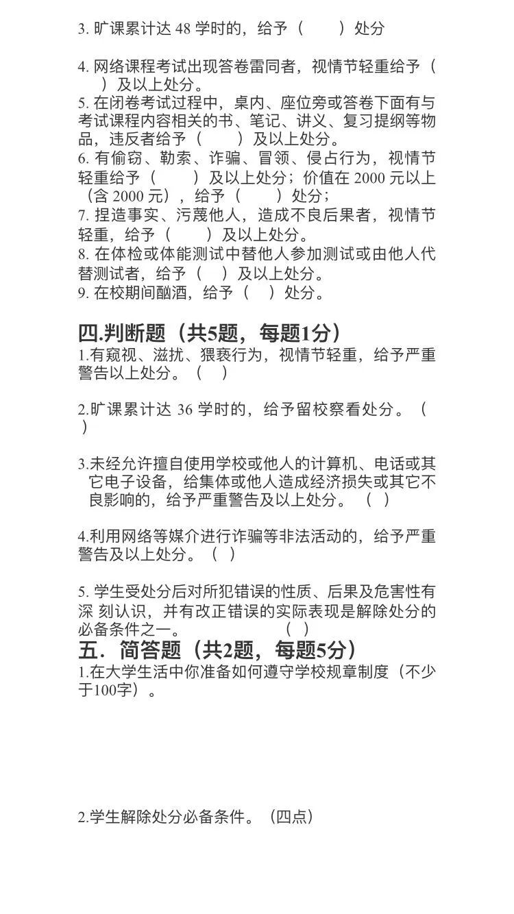 考试内容围绕《学生手册》,通过单选、多选、填空、判断、简答等题型,考察了学生对我校关于学生学习和生活相关的各项规章制度和校规校纪的掌握情况。虽然是线上答题,但同学们态度积极,严守纪律,考场秩序井然。