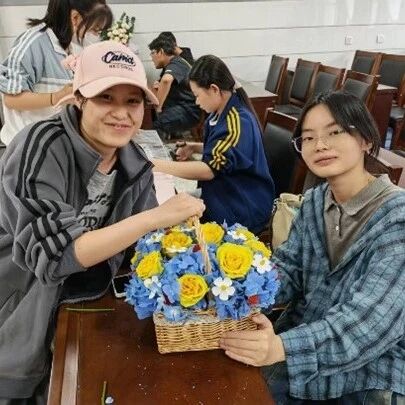 实操过程中,在老师的协助下,同学们将玫瑰、洋桔梗、小雏菊等花材,按照自己的创意搭配色彩、调整布局,和同伴交流想法,活动尾声,同学们展示自己的作品,分享创作思路与实践心得,并与作品合影留念。