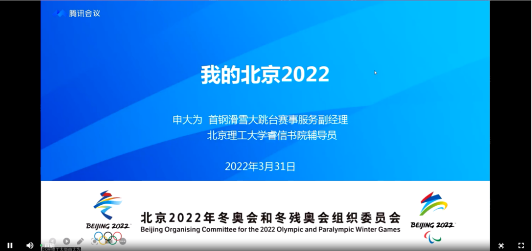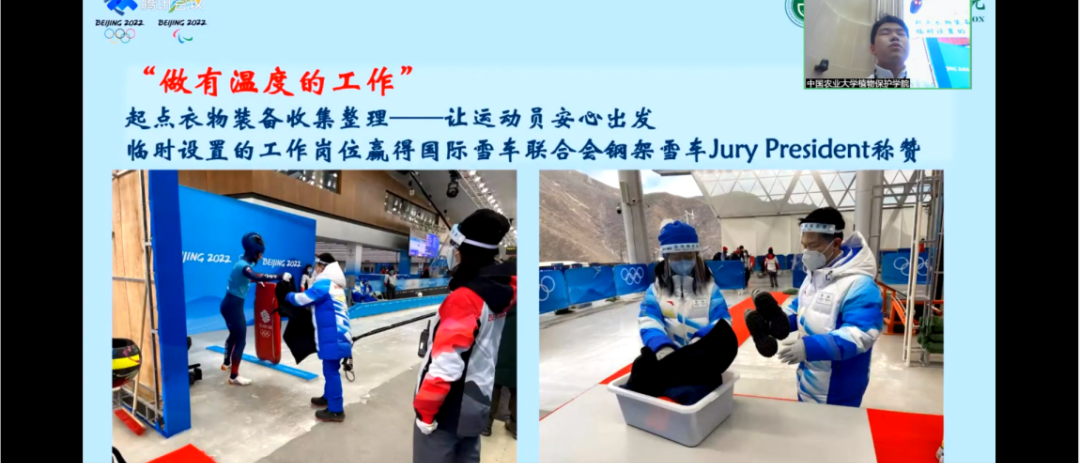 首钢大跳台赛事服务副经理申大为分享了在服务期间的工作,如:志愿者的培训、各类突发事件的应对、志愿者的心理疏导等,冬奥会的顺利进行离不开每一个工作人员、志愿者背后的付出,他们坚守岗位、坚守初心、努力提高服务标准,为冬奥会保驾护航。