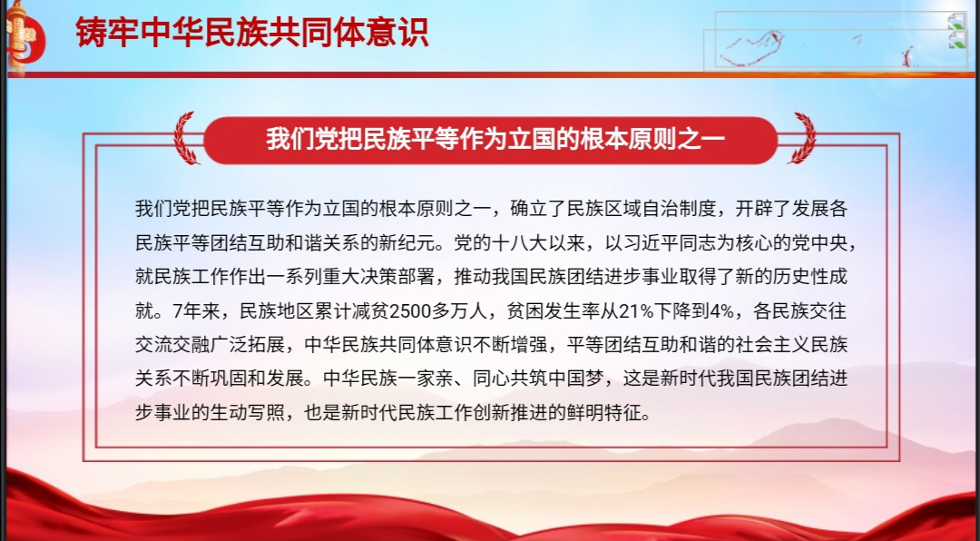 本次团日活动有三个流程。首先组织人王丹讲述了中华民族共同体的提出并解析了其内涵,让同学更加透彻的了解了中华民族共同体。其次,王丹向同学们展示了她自制的小视频,让大家明白了没有各民族的共同团结奋斗,就没有中华民族的今天;没有各民族的和睦相处、和衷共济,就没有中华民族的明天。