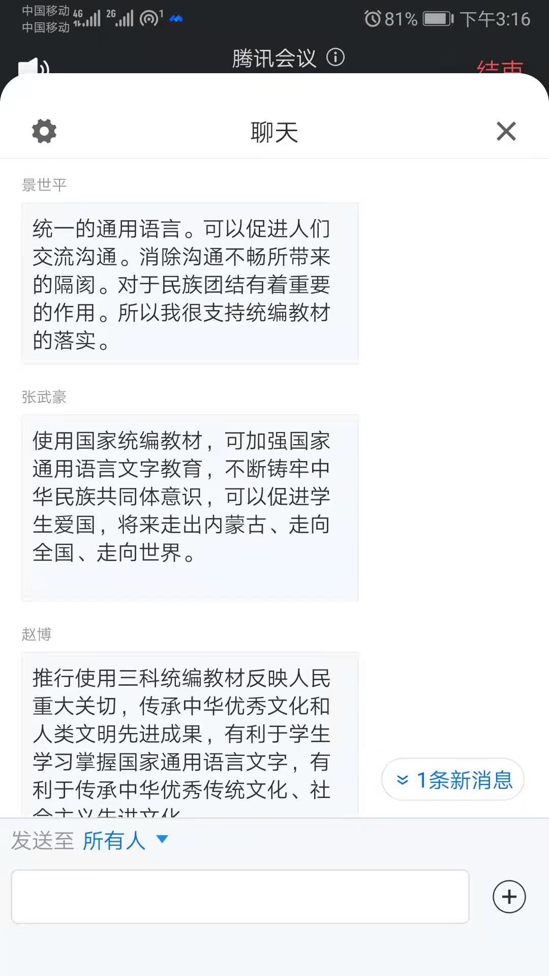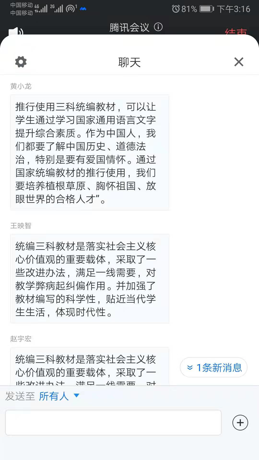 会议初,由团支书李茂径开介绍活动主题,参会人员。紧接着,班主任就统编三科教材问题,疫情常态化问题,毕业生毕业设计有关的学术问题,毕业后就业问题,民族复兴和民族团结问题,对学生们进行了深刻地教诲与指导。随后,同学们分别畅谈自己对当下国家民族局势的认识与理解,对自己人生未来的憧憬和规划。活动中,有的同学认为:“本次统编三科教材对民族团结产生的深远影响,作为一名大学生,应该主动承担起维护民族团结的责任,深刻理解做好民族工作的主要意义。最后,由团支书总结发言。