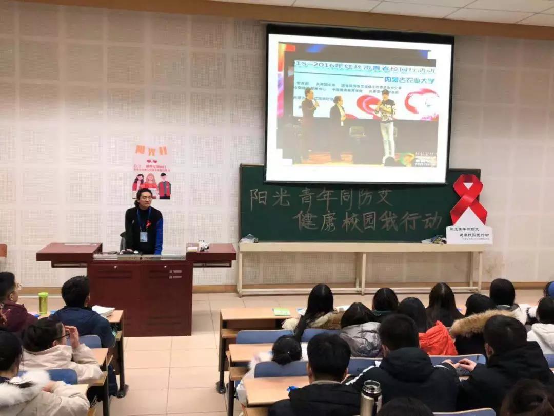 19级学生与外语学院19级学生在东区电教楼参加了由内蒙古农业大学青春健康同伴社开展的主题为“阳光青年同防艾,健康校园我行动”艾滋病预防知识讲座。内蒙古农业大学青春健康同伴社季玉龙同学担任本次讲座主讲人。