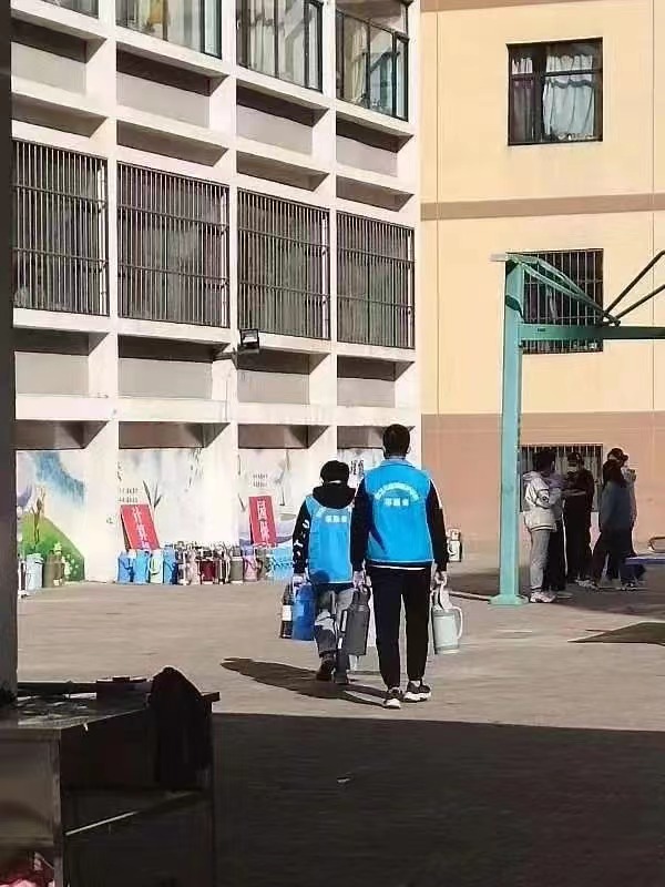 志愿者为封控学生提供热水与帮助,大家分工明确、迅速投入自己的工作岗位中,他们有的卸运,有的在分发,一壶壶水、一次次的往返,每一位志愿者都撸起了袖子,铆足了劲,不退缩、不怕苦,努力为保障封控学生的正常生活尽自己的一份力,平凡的力量闪烁出不平凡的光芒。