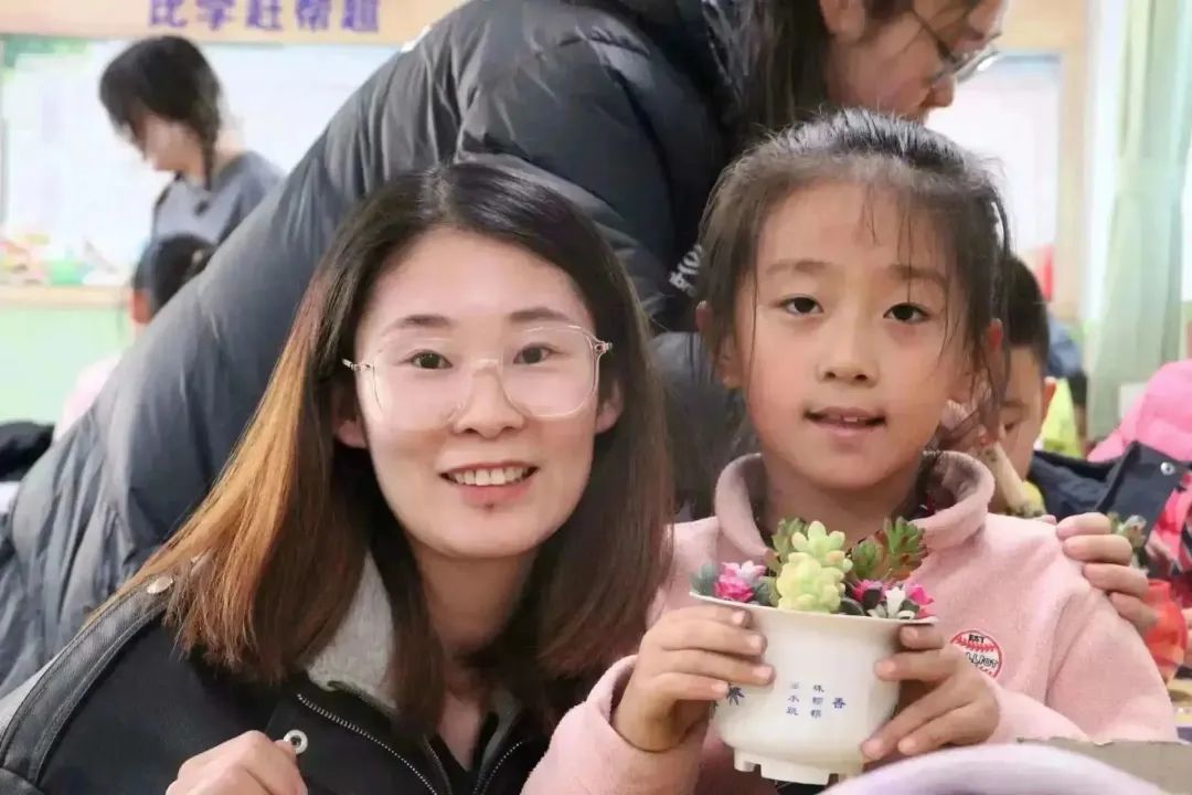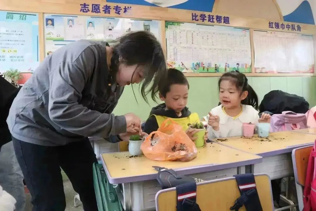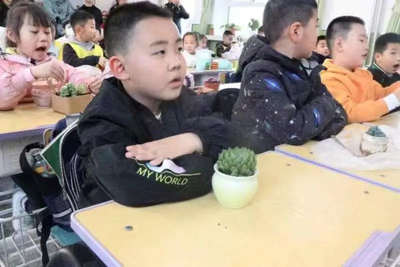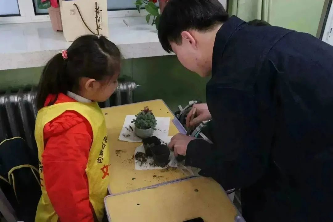 的学生党员、学生干部细心协助小朋友们进行多肉盆栽,在大哥哥大姐姐的帮助下,一盆盆精美的多肉植物呈现在大家面前。