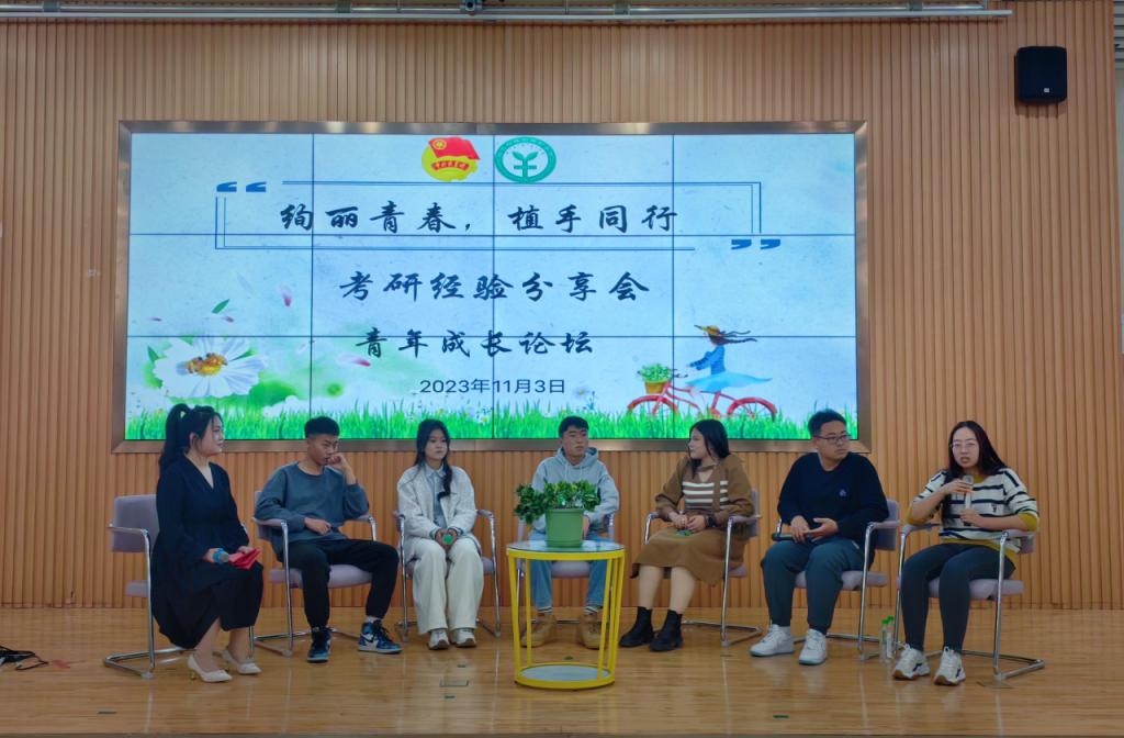 于创新创业学院三楼顺利举办“绚丽青春,植手同行”青年成长论坛之考研经验分享会。本次活动邀请到王蕊、徐磊、张芷若、刘岩、梁朝阳、潘智伟六位同学作为分享嘉宾,2020级王杰同学为本次会议主持人。