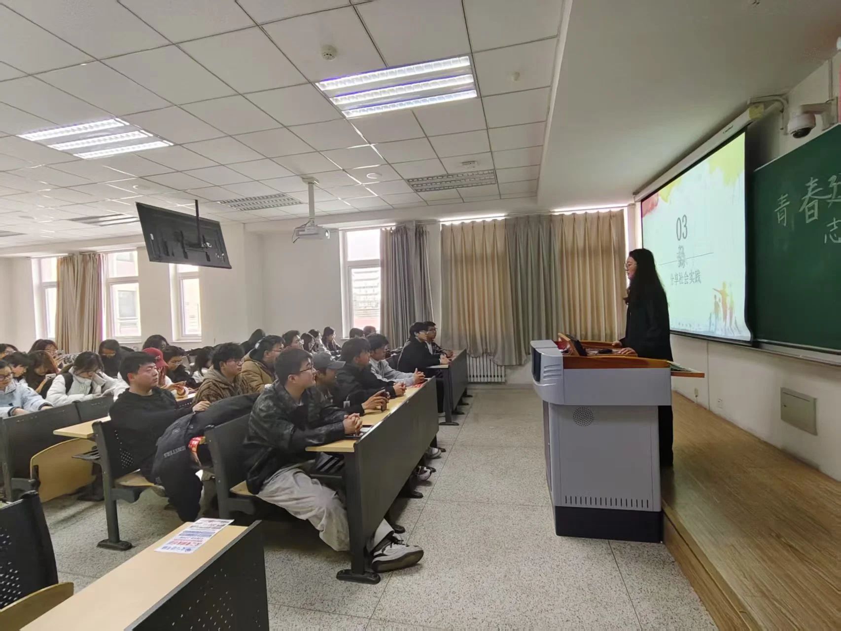 活动伊始,通过一段展现内蒙古发展成就与志愿服务风采的视频,让同学们深刻感受到这片土地的魅力和志愿服务的力量。随后,请假期投身志愿服务的同学代表分享了他们的故事。从助力乡村教育,为偏远地区孩子送去知识与温暖,到参与生态保护行动,守护内蒙古的绿水青山,这些真实且动人的经历,让现场同学们都深受触动。活动最后,同学们表达了投身志愿服务、建设美好内蒙古的坚定决心。