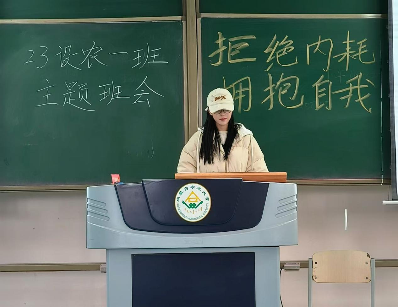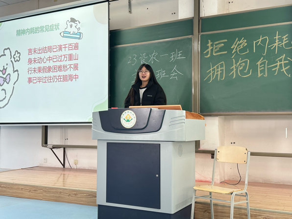 23级设农一班开展了以“拒绝内耗,拥抱自我”的线下主题班会,班主任潘璐参加会议,23级设农一班的郭静宜主持会议,该班会在班级内掀起了一股相信自己,永攀高峰的热潮。
