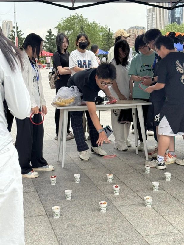 趣味项目围绕“自我关怀”与“情绪调节”设计,兼具娱乐性与心理疏导功能。同学们通过完成游戏收集奖章,兑换奖品。“套圈”游戏区,参与者通过投掷套圈套取水果,“夹气球”环节考验协作能力,两人一组背对夹球前进,笑声此起彼伏。游戏过程中,同学们相互配合、默契十足。“拼字解谜”区域同样人气高涨,同学们需从字卡中抽出四张拼成字。最具挑战性的当属“抖乒乓球”游戏,参与者需将绑在腰间盒子里的乒乓球通过身体抖动全部甩出,限时内完成任务即可获得奖章。同学们捧着用奖章兑换的奖品,笑容洋溢在脸上。