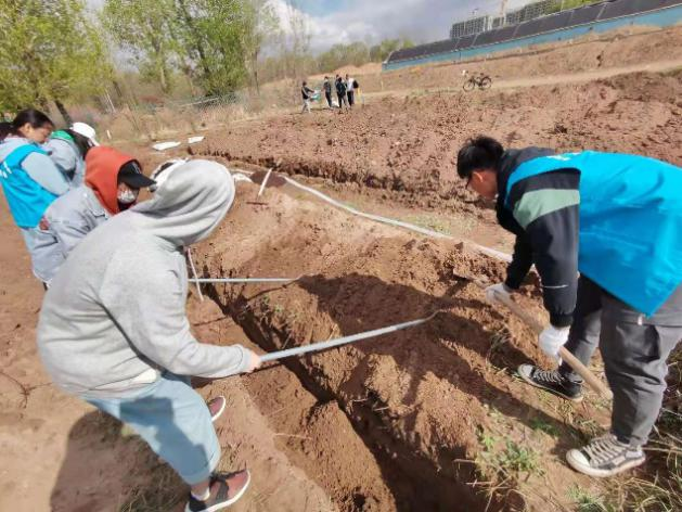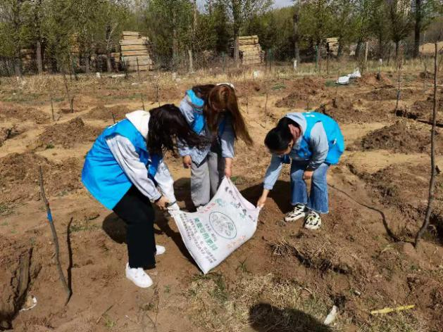 全体党员集合后,大家统筹规划,合理分工,着手开展建设果园的专业实践活动。铁锹队的同志负责铲土,保证土填满20cm;刮耙队的同志负责拢土堆土,再加入一层粪肥,继续填满20cm。虽然风大天冷,但并没有一个人喊累,同志们齐心协力、相互配合,干得热火朝天。在大家的共同努力下,肥土混合均匀并松软透气,一道道肥沃的土地整齐的排列在田间。看着丰硕的劳动成果,想象着不久的将来果园中硕果累累的景象,大家不约而同地露出开心的笑容。