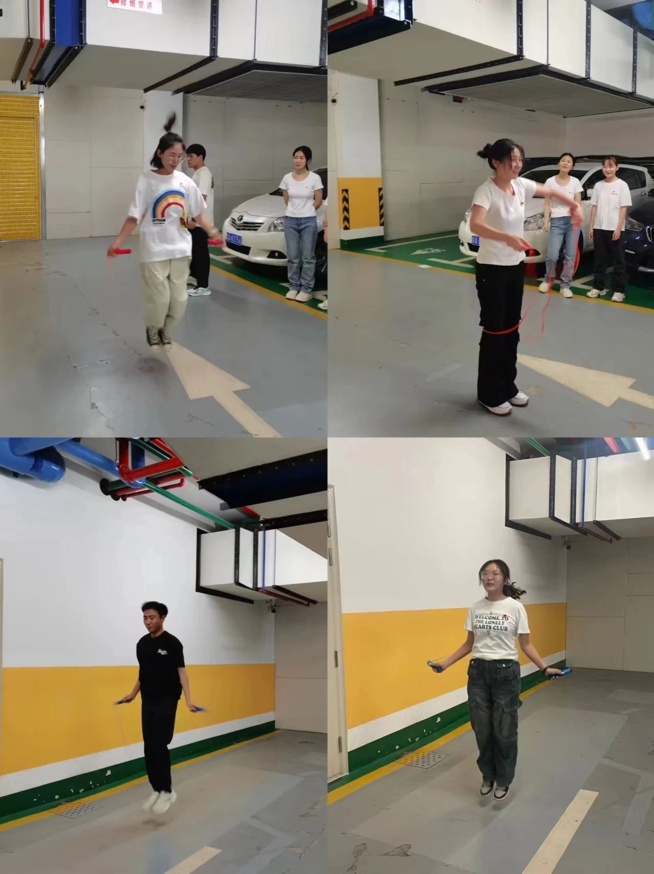 跳绳比赛中,只见一根根跳绳在空中快速飞舞,跳绳与地面的抽打声此起彼伏,大家轻盈的身姿如同跳跃的音符,同志们相互鼓励、相互配合,为了团队的荣誉而努力。