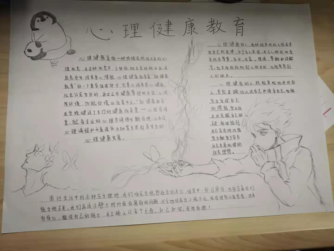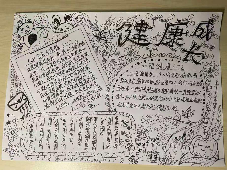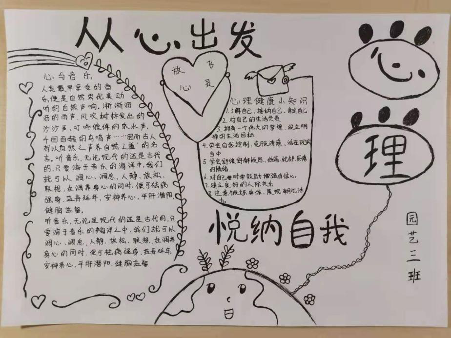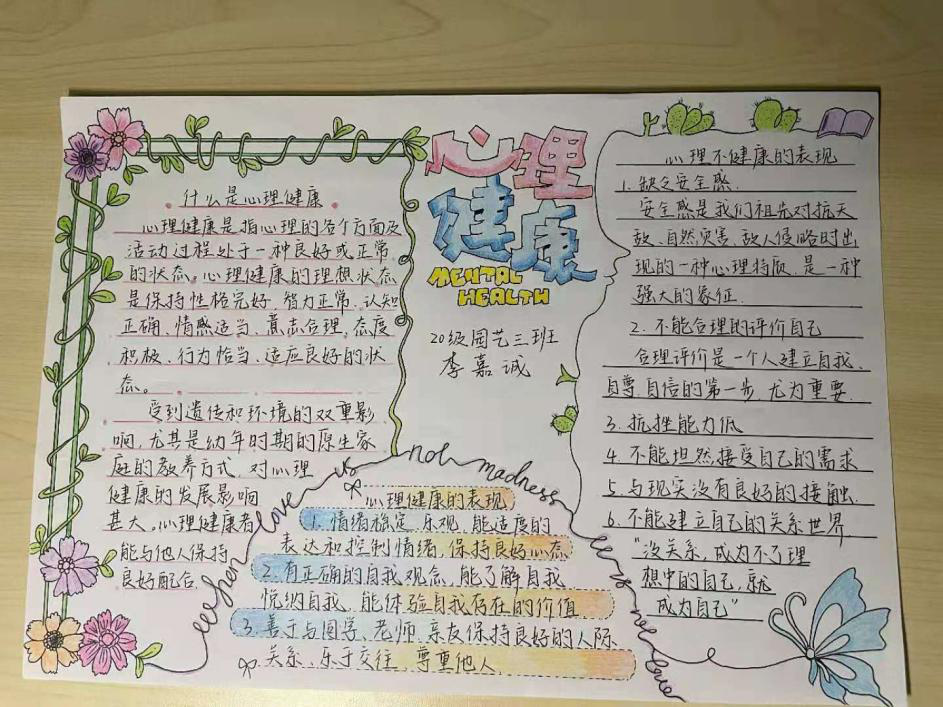 心理健康可以促进大学生全面发展,健康的心理品质是大学生全面发展的基本要求,也是将来走向社会,在工作岗位上发挥智力水平、积极从事社会活动和不断向更高层次发展的重要条件。充分认识德智体美劳等方面的和谐发展,是以健康的心理品质作为基础的,一个人心理健康状态直接影响和制约着全面发展的实现。下面图片是20级园艺三班同学制作的心理健康主题手抄报,一幅幅精美别致的作品向大家展示了大学生应有的健康的心理状态。