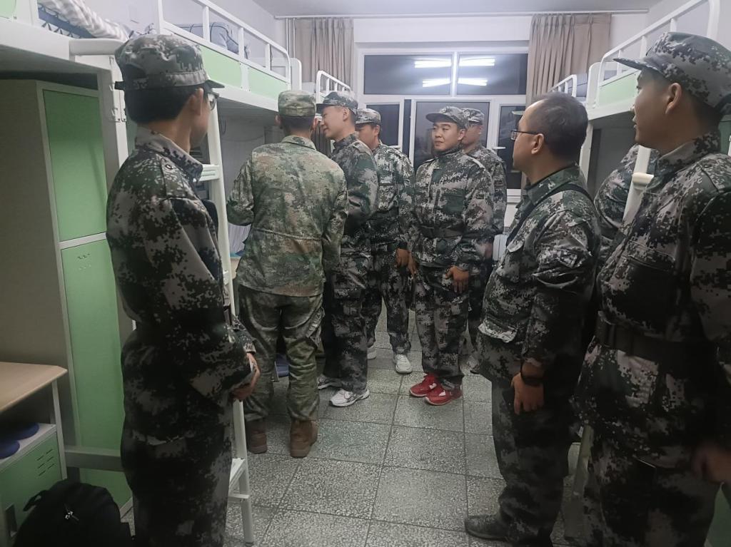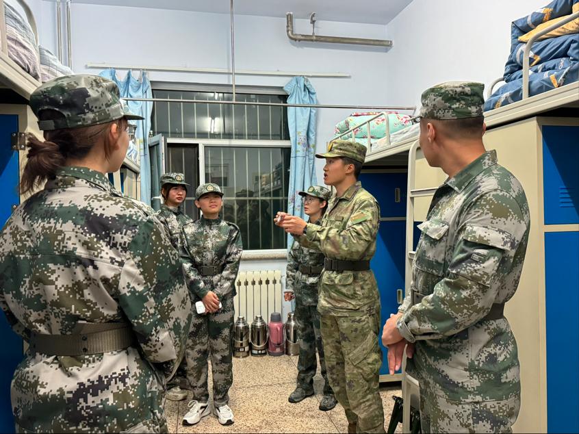辅导员和军训教官深入学生宿舍,实地检查学生内务整理情况并进行指导。