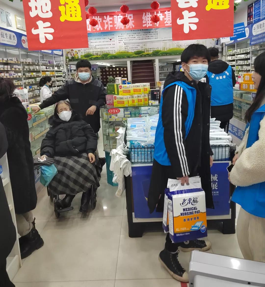 志愿者们协力帮助叶大姐打扫房间后,大家一起推着轮椅和叶大姐去超市购买生活必需品。一路上,她耐心的为不熟悉城市的同学介绍各处。大家一路欢笑,其乐融融。
